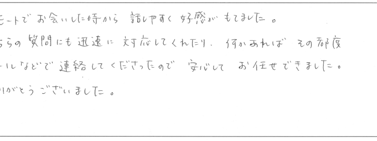 こちらの質問にも迅速に対応してくれたり、何かあればその都度メールなどで連絡してくださったので安心してお任せできました。