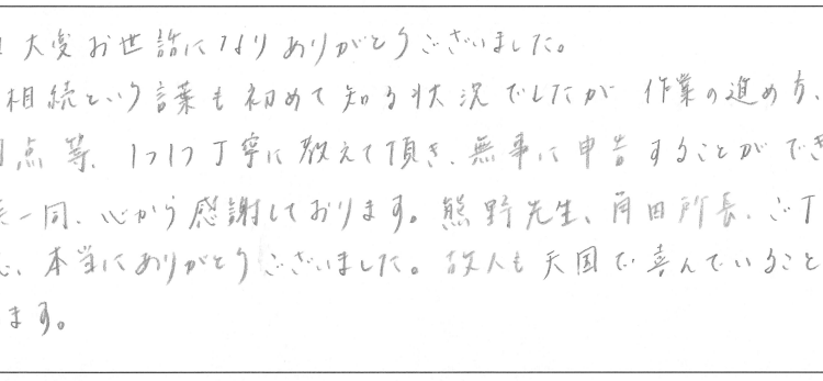 2次相続という言葉も初めて知る状況でしたが、作業の進め方、疑問点等、1つ1つ丁寧に教えて頂き、無事に申告することができ、親族一同、心から感謝しております。熊野先生、角田所長、ご丁寧な対応、本当にありがとうございました。故人も天国で喜んでいることと思います。