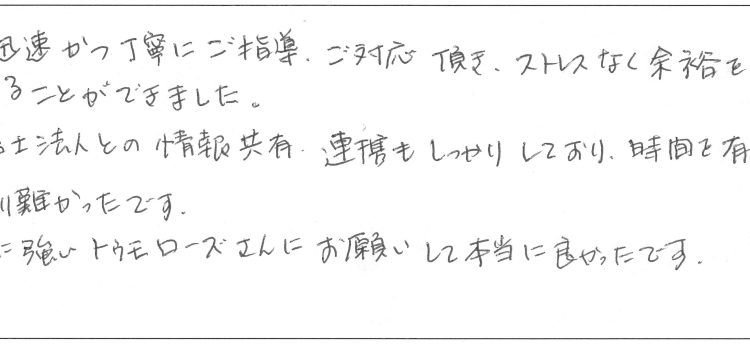 いつも迅速かつ丁寧にご指導、ご対応頂き、ストレスなく余裕を持って納付することができました。行政書士法人との情報共有、連携もしっかりしており、時間を有効活用でき有り難かったです。