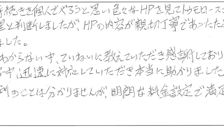最初、相続税の手続きを個人でやろうと思い色々なHPを見てトゥモロースさんにたどり着きました。結局、素人では無理と判断しましたが、HPの内容が親切丁寧であったため記憶に残り、御社に決定しました。