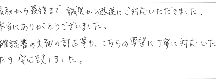 最初から最後まで、誠実から迅速にご対応いただきました。本当にありがとうございました。