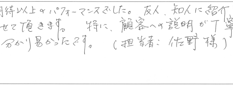 期待以上のパフォーマンスでした。友人、知人に紹介させて頂きます。特に、顧客への説明が丁寧で分かり易かったです。(担当者:佐野様)