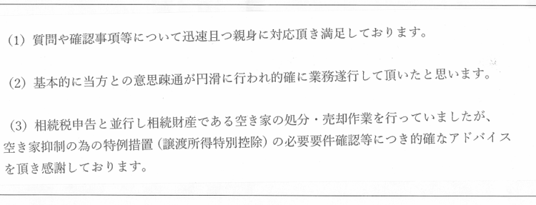 (3)相続税申告と並行し相続財産である空き家の処分・売却作業を行っていましたが、空き家抑制の為の特例措置(譲渡所得特別控除)の必要要件確認等につき的確なアドバイスを頂き感謝しております。