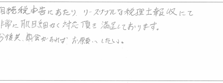 相続税申告にあたり、リーズナブルな税理士報収にて非常に肌目細かく対応頂き満足しております。今後共、期会があればお願いしたい。